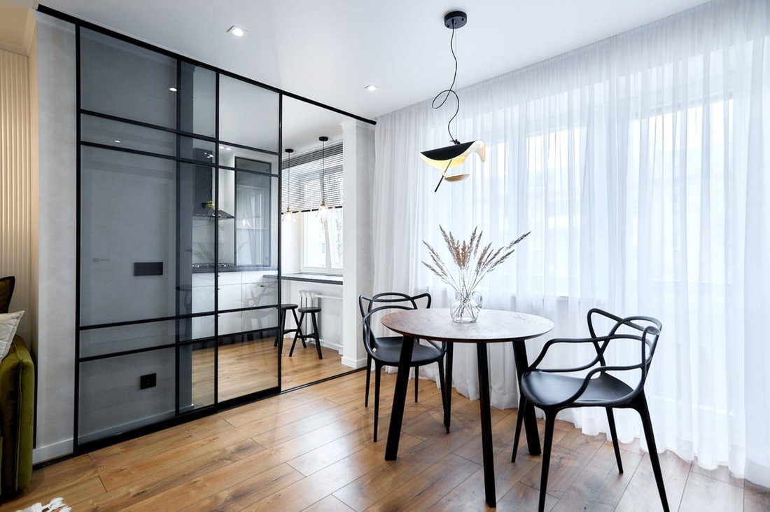 Стеклянные столы, акриловые стулья, открытые стеллажи — такие предметы кажутся невесомыми и не загромождают интерьер. Если есть возможность, замените глухие перегородки на стеклянные или вовсе откажитесь от них в пользу открытых планировок.